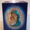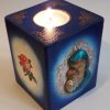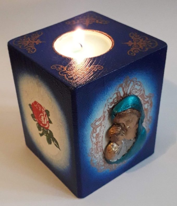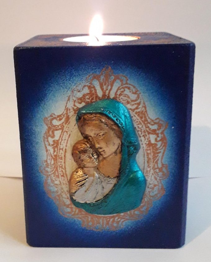 Puno drvo obojano akrilnim bojama. Svijeća s reljefnom Gospom i ukrasnom štambiljem te mirisnom lučicom.