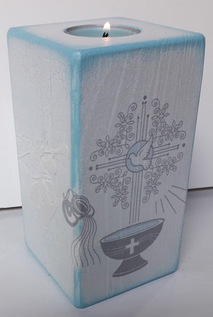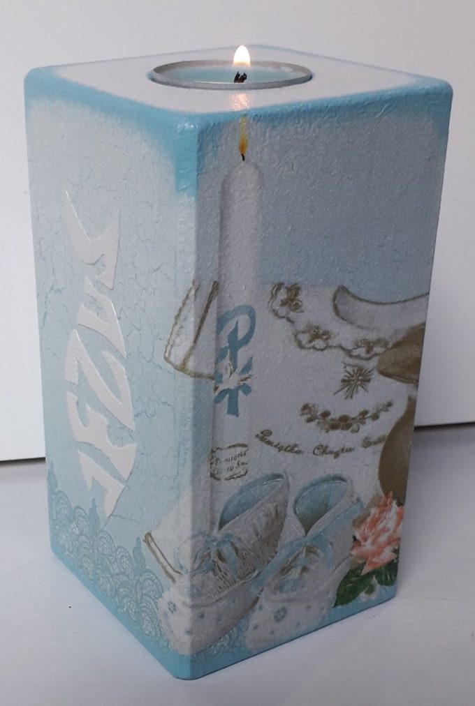 Svijeća u salvetnoj tehnici s reljefnim natpisom Jezus